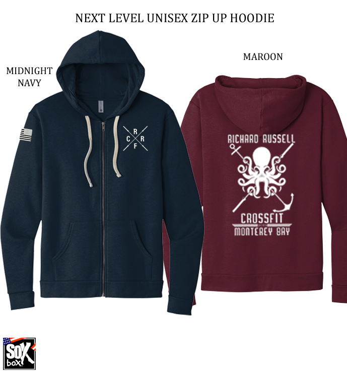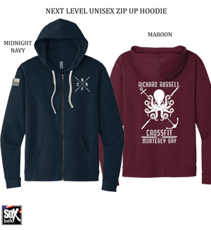 Get ready to turn heads at your next workout with the RRCF Monterey Octopus CrossFit Unisex Zip Up Hoodie! With a variety of colors to choose from, this custom-made unisex hoodie is perfect for showing off your CrossFit pride. From workouts to community events, this shirt is the ultimate way to rep your sporty and playful side. (Plus, who doesn't love repping Richard Russell CrossFit?!)
